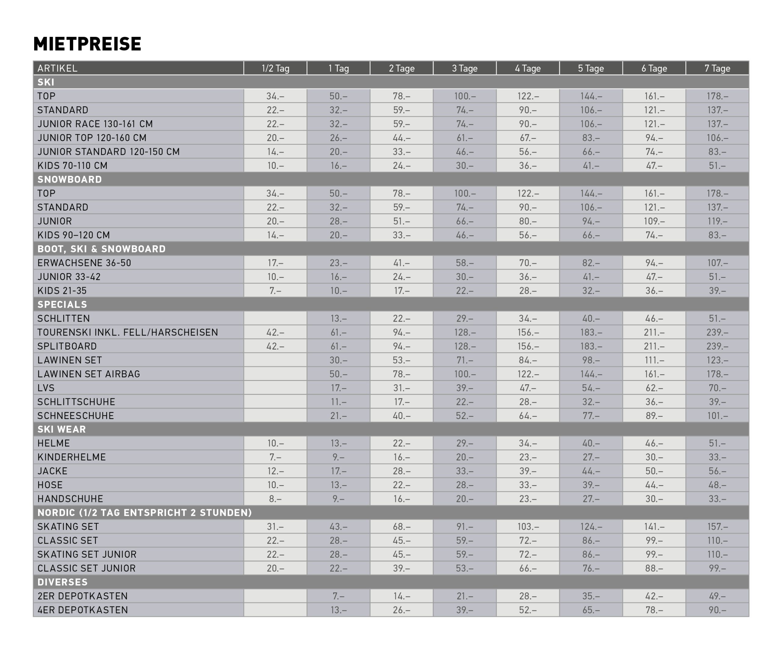 Die komplette Mietausrüstung oder die einzelnen Artikel werden für die Wintersaison 2025/2026 gemietet und Ende Saison zurückgegeben.